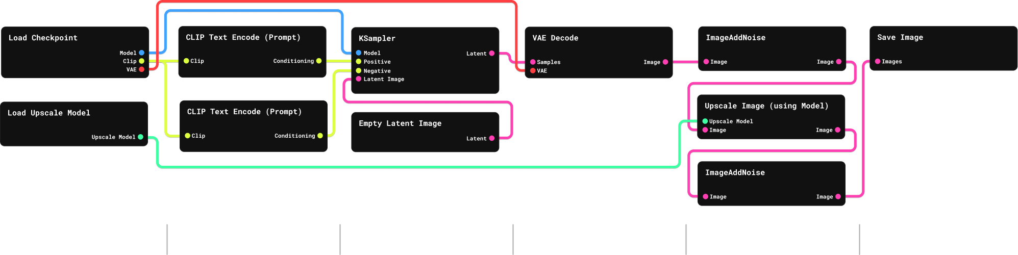 | Empty Latent Image | AI Generation | Defines the initial resolution and aspect ratio in "latent space" - a compressed mathematical environment where the noise is processed |